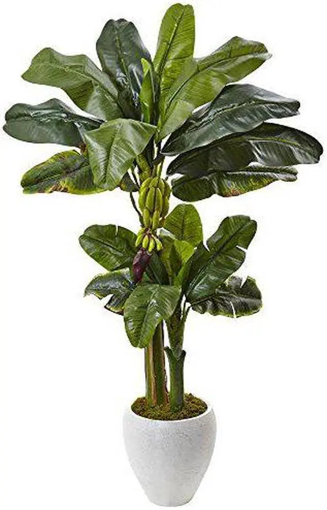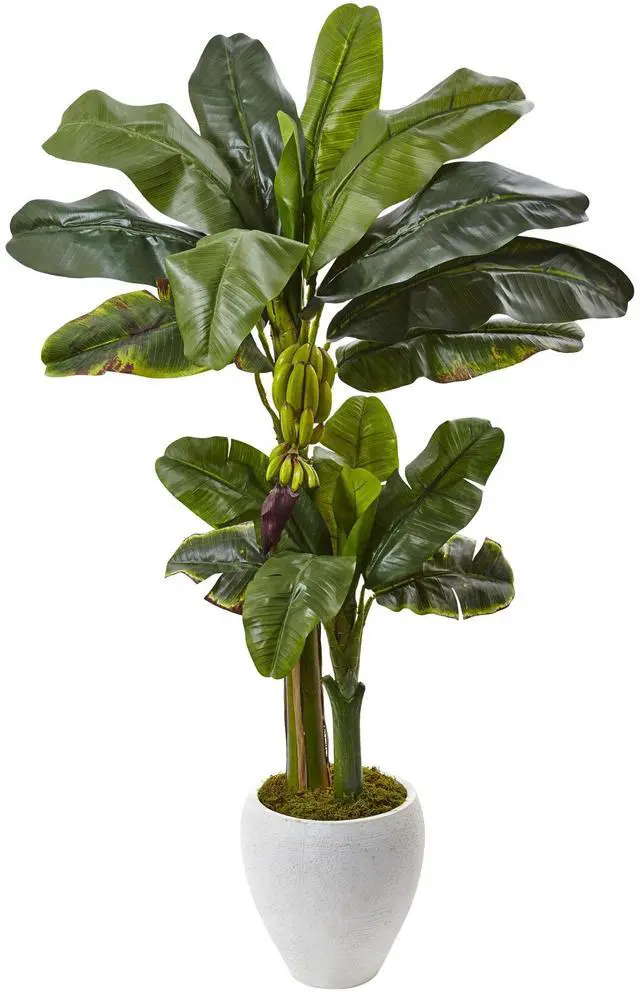 Enjoy the trees of the tropics year-round with an exotic Banana tree. Subdued hues of green and yellow gather in the faux bunch for a realistic appearance. Large banana leaves offer depth and height to a room in need of more dimension. Pair with a white sectional and wood grain tables for a complementary look. Includes textured planter. Banana Tree stands 5' tall.