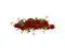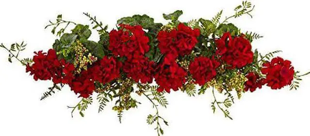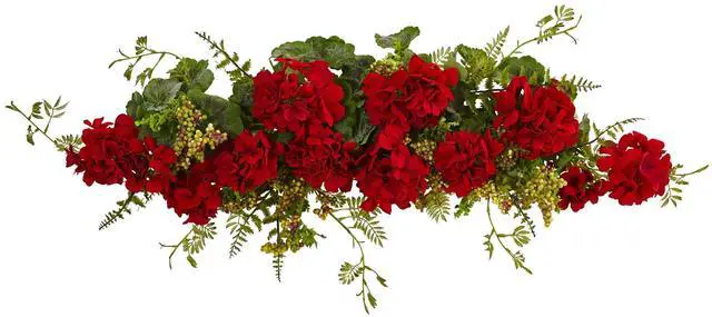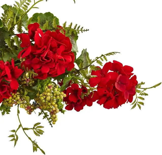 Dainty berries mixed with vibrant red geraniums creates a colorful home decor display. The blooming geraniums burst intermixed with a variety of green leaves for a textured and lifelike arrangement. Place on a mantel or display on a shelf for festive display.