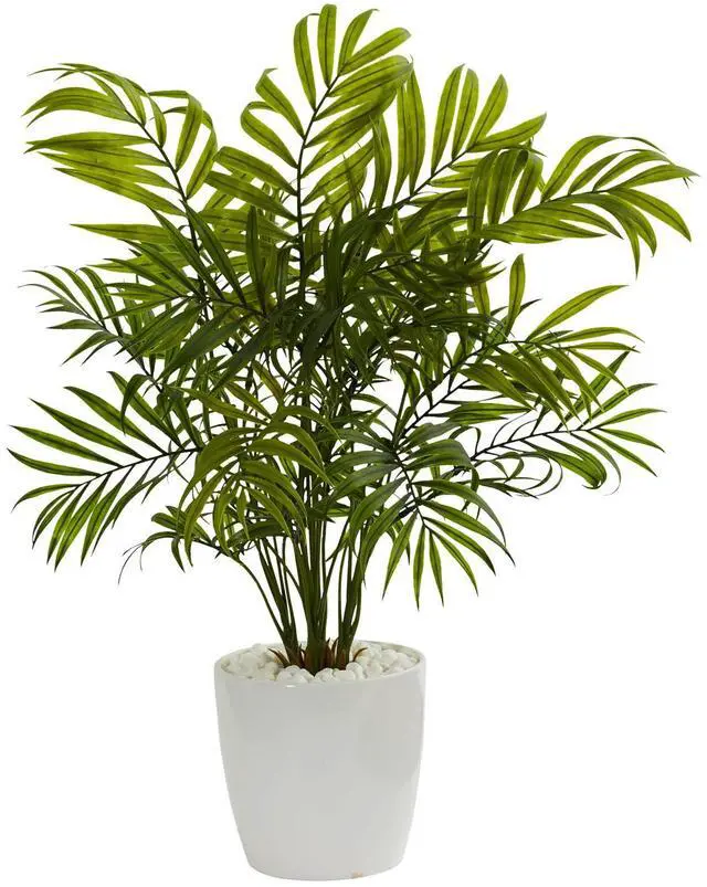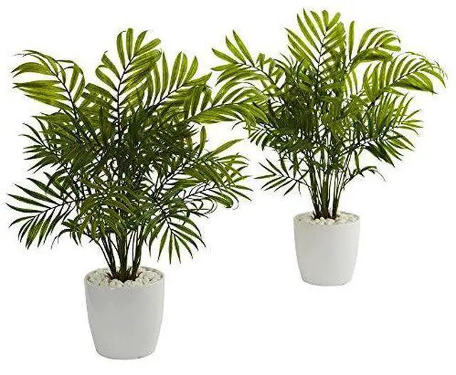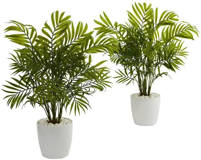Various green fronds extend upward to bring vibrant lifelike leaves toward the sunlight. These set of 2 artificial palms come in white planters with light colored rocks that bring out the deep green of the foliage. Use them as a set or separate them.