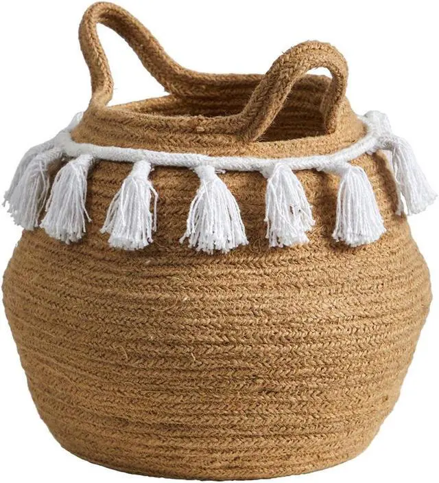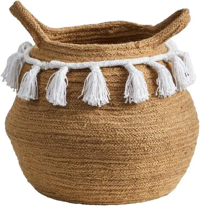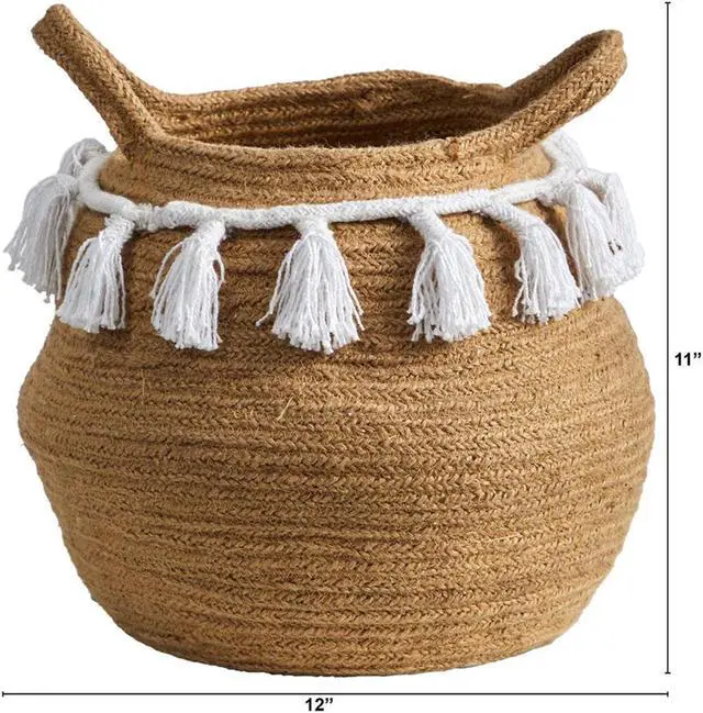 This beachy and easy-going Bowl Hand Stitched Basket is perfect for a relaxed lifestyle. A white rope with tassels wraps around the brown basket for a refined look. Standing 11" house your favorite trees such as Fiddle Leaf Figs, Ficus, or Olive tree. No drainage hole and for indoor use only. Perfect for boho, coastal, or eclectic or modern lifestyles.