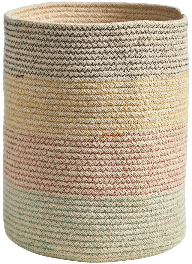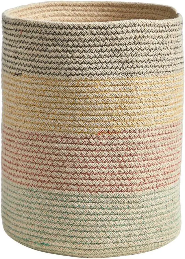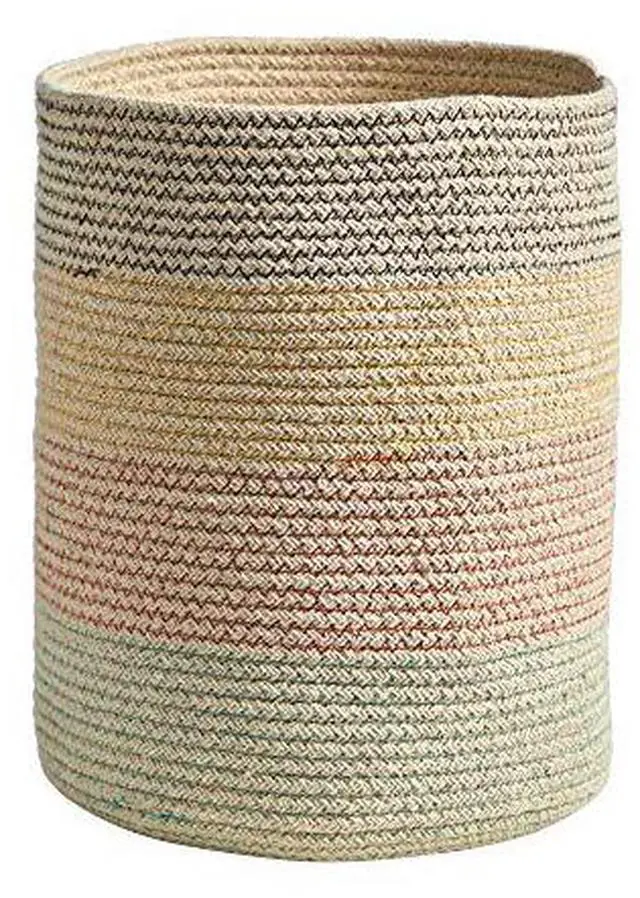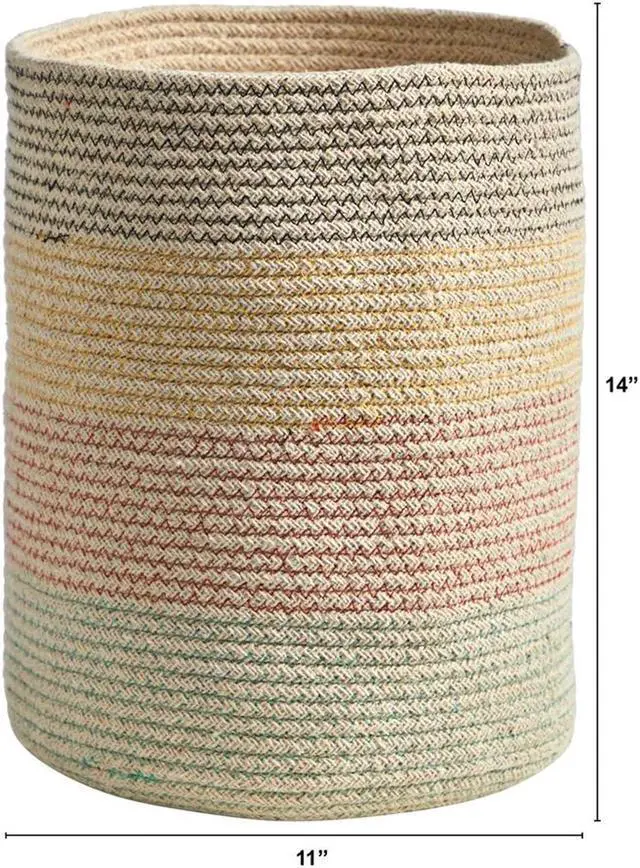 House your favorite plant in this Hand Stitched Basket. Four tiers of soft colors wrap around this hand-stitched basket that complements boho, modern, coastal, and other style decors. Standing 12" add a Fiddle Fig Leaf, Olive tree, or any other tree. No drainage hole and for indoor use only.