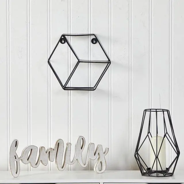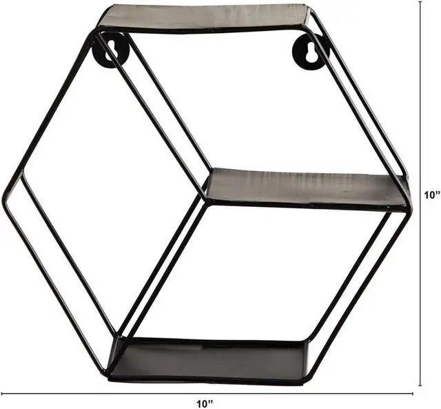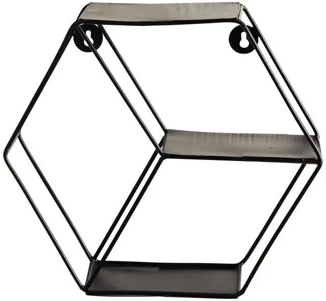 Who says shelves have to be boring? Get organized with this black hexagon wall shelf. Stylish yet functional, the versatile geometric piece can house a small plant, picture frame, or another accent. The geometric space brings clean lines to any room that needs a focal point. You can even add multiples in the same room for a cohesive look. Standing 10", this accent comes ready to hang.
