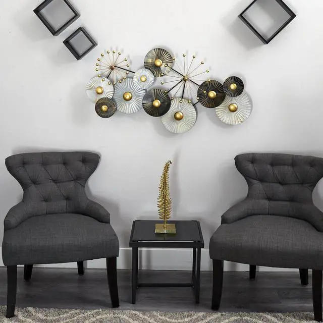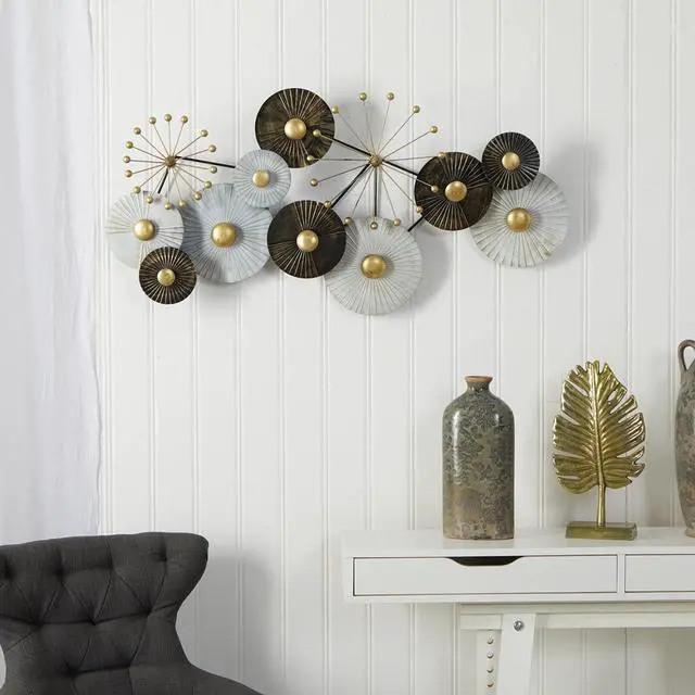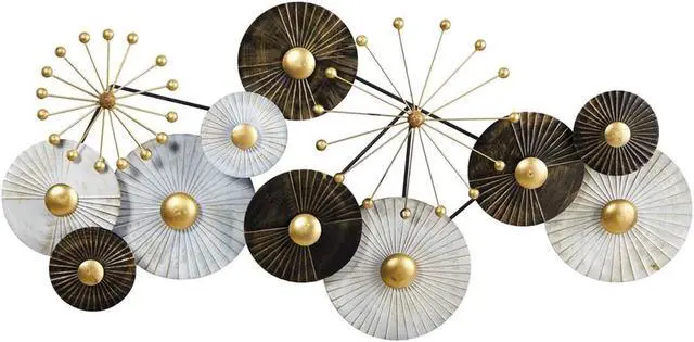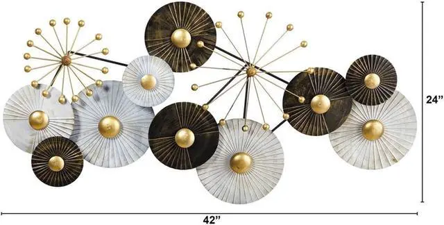 Welcome to the future with this modern multi-dimension metal wall art Decor. Plates in different finishes are accented by a brass ball in the middle, perched on top is a sputnik like design. The metal complements the brass hardware, creating a focal point for all that set eyes on this 3D artistic piece. With dimensions of 3.5 X 2', house in any space that needs a refined touch. Perfect for contemporary, modern, and upscale decors.