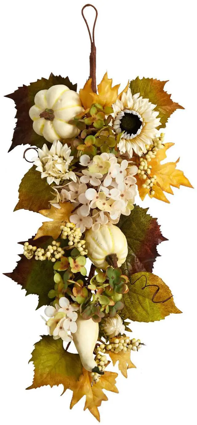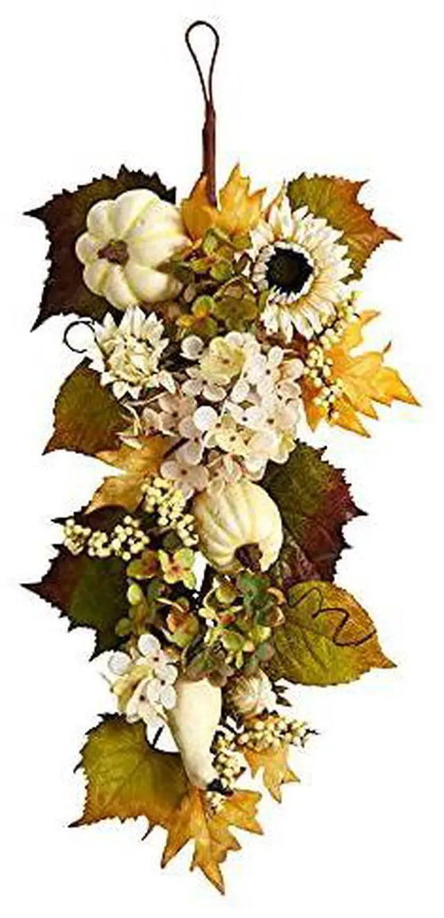 Capture the beauty of fall with this Autumn Sunflower and Pumpkin Artificial Teardrop. Variegated sunflowers and hydrangeas adorn a green silhouette of leaves, accented by a palette of fall-foliage inspired leaves. To soften the look and bring a rustic, intimate touch, pumpkins bring an exciting draw to the eye and color. With dimensions of 33", curate this teardrop in a bare wall or door. Perfect for the Harvest season and Thanksgiving
