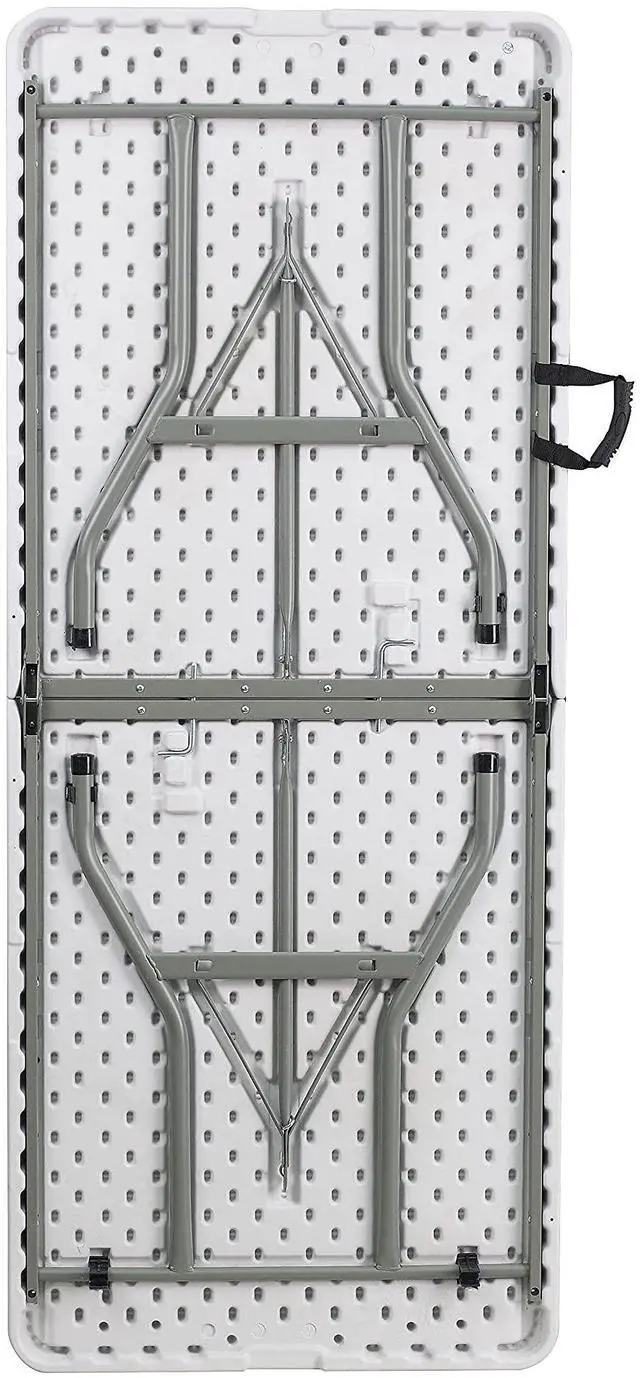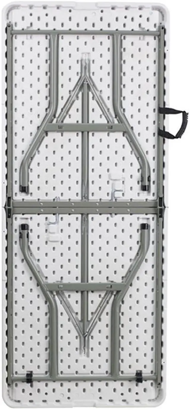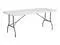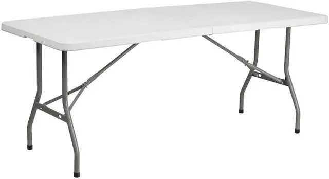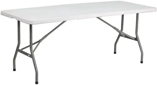 This rectangular folding table is 6 feet long and is beneficial in a multitude of settings that include banquet halls, conference centers, cafeterias, schools and in the home. The table can be used as a temporary seating solution or be setup for everyday use. The bi-fold feature folds the table in half the size and includes a carrying handle for easy transport. The durable blow molded top is low maintenance and cleans easily. The table legs fold under the table to make storage more convenient and for better portability. This table is commercial grade to withstand everyday use in the hospitality industry.