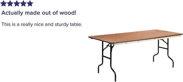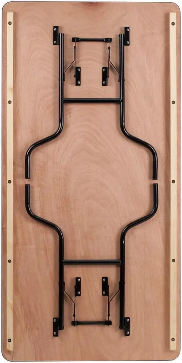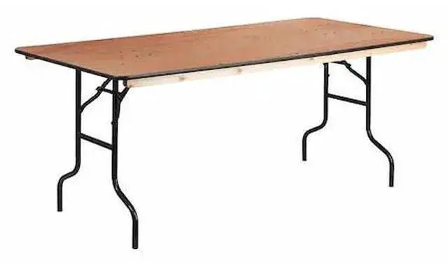 If you want a table that is sturdy, long-lasting and versatile enough to use anywhere this heavy duty folding table is as good as it gets! The Rectangular Wood Folding Banquet Table is a commercial grade table that can be used as a training table, trade show booth, or a banquet table. Featuring an Okoume hardwood surface, this table is 6 feet long, 3 feet wide and .75 inches thick, with a blackedge band. It has a 580 pound static load capacity and will seat up to 8 adults. Its durable, easy to clean tabletop is sealed with a quadruple coated polyurethane varnish. The underside of the table is finished with a double coated polyurethane varnish. Two heavy duty, wood runners, secured to the underside of the table, increase load capacity and allow for more secure stacking, transport and storage. The heavy duty wishbone legs lock securely in place when the table is in use. A black powder coating protects the legs from scratches, and non-marring floor caps protect your floor. This is a particularly good choice for party rental companies and other organizations that hold many events throughout the year.Product Dimension-36"W x 72"D x 30"H