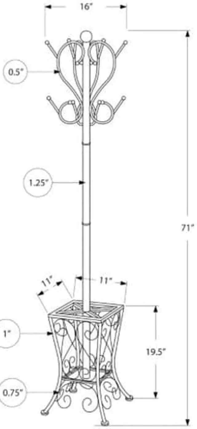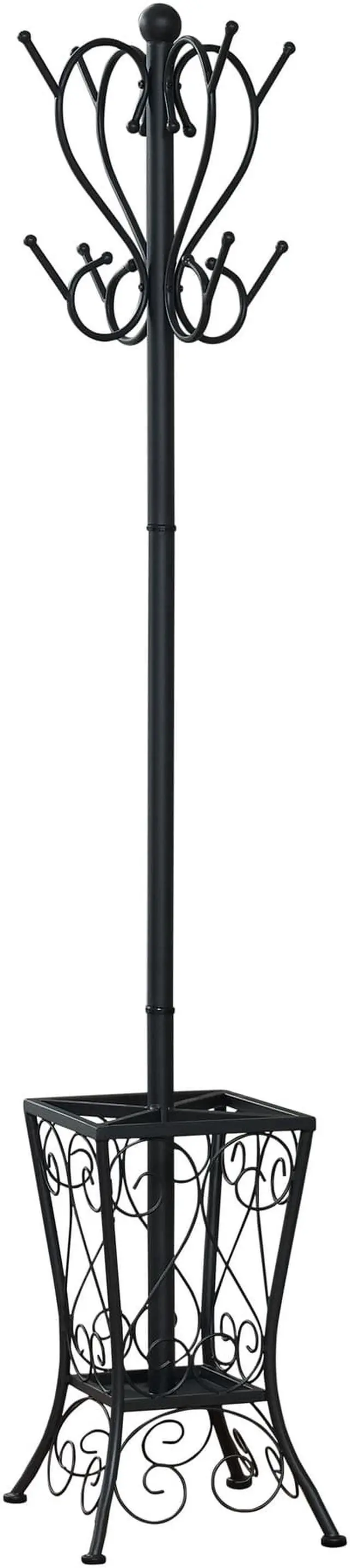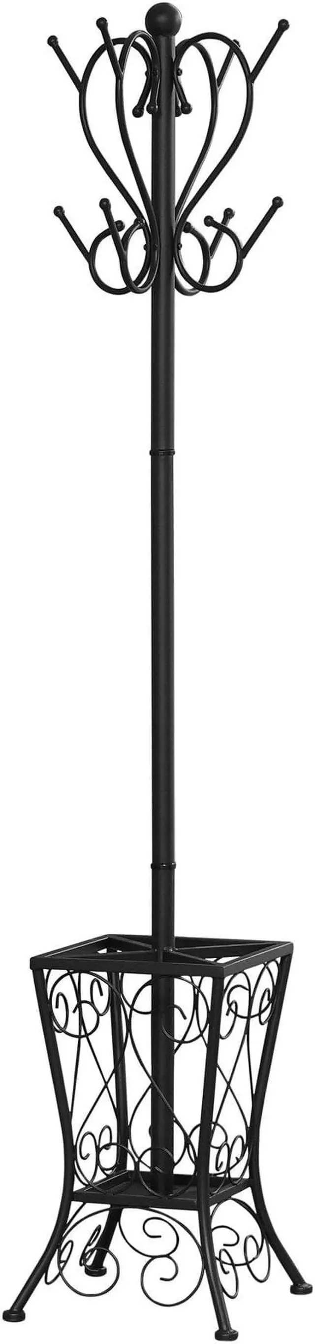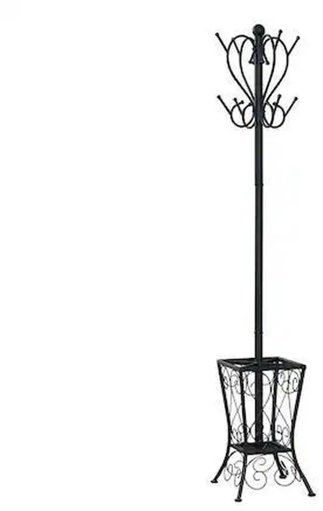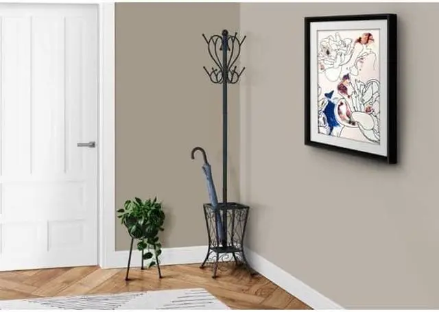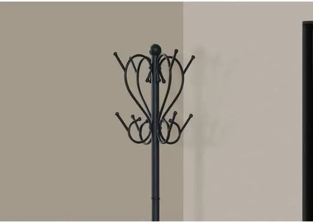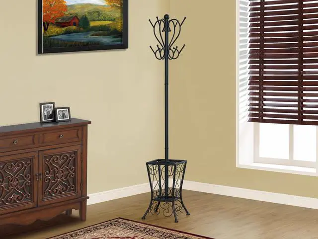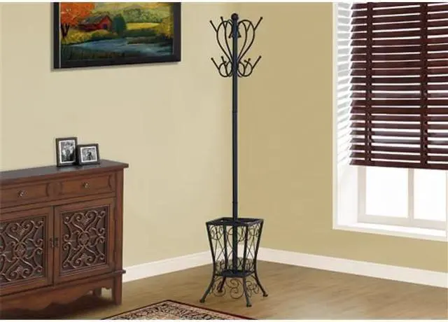 I 2060 Coat Rack By Monarch Specialties Enhance the look of your entryway or hallway with this black metal coat rack. The two tiered curved pegs paired with an elaborately scrolled basket offers the perfect place to store hats, jackets, scarves and umbrellas. The classic appeal of this coat rack lends itself to a stylish elegance reminiscent of a romantic Parisian apartment that will provide you with years of lasting enjoyment.
