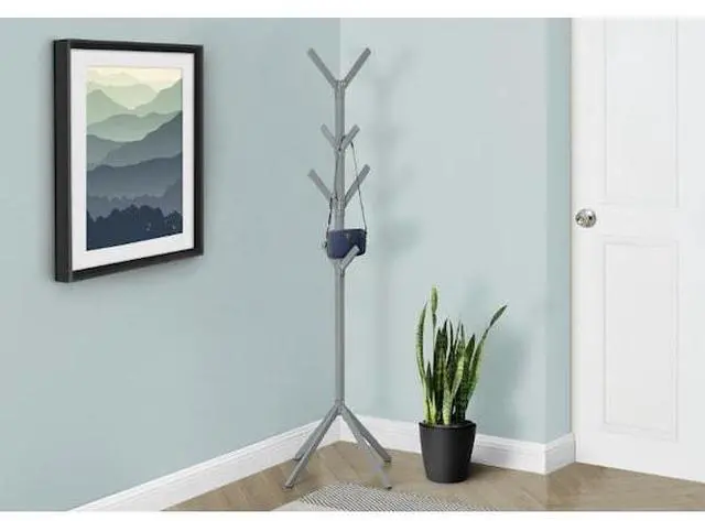 Get those coats and scarves off the chair and onto this modern, industrial style metal coat rack! Featuring 4 tiers of 8 hanging hooks that easily hold coats, drape your scarves, or hang some beautiful purses as a unique and stylish storage solution. The sturdy 4-pronged base helps to keep the weight properly distributed. With a chic silver matte finish, this coat rack will anchor that corner of your entryway, bedroom, and your office for a strong, contemporary look. Assembly is required.
