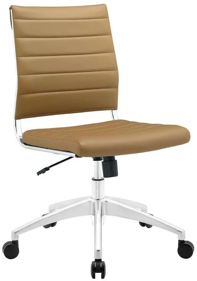 Steer the course and sail to an island called style. Jive is the result of chair makers who decided to design a chair that just works. Functionally, it is a pleasure to sit in as the durable ribbed vinyl back provides natural posture support. The seat cushion comes well padded, while the armless construction makes this a perfect piece for conference rooms and desk work. Jive’s chrome-plated aluminum base is fitted with five dual-wheel casters, while a tension knob and tilt lock allow for easy back position adjustments. This is a chair made for the modern office, and a welcome embodiment of the spirit of progress and determination.