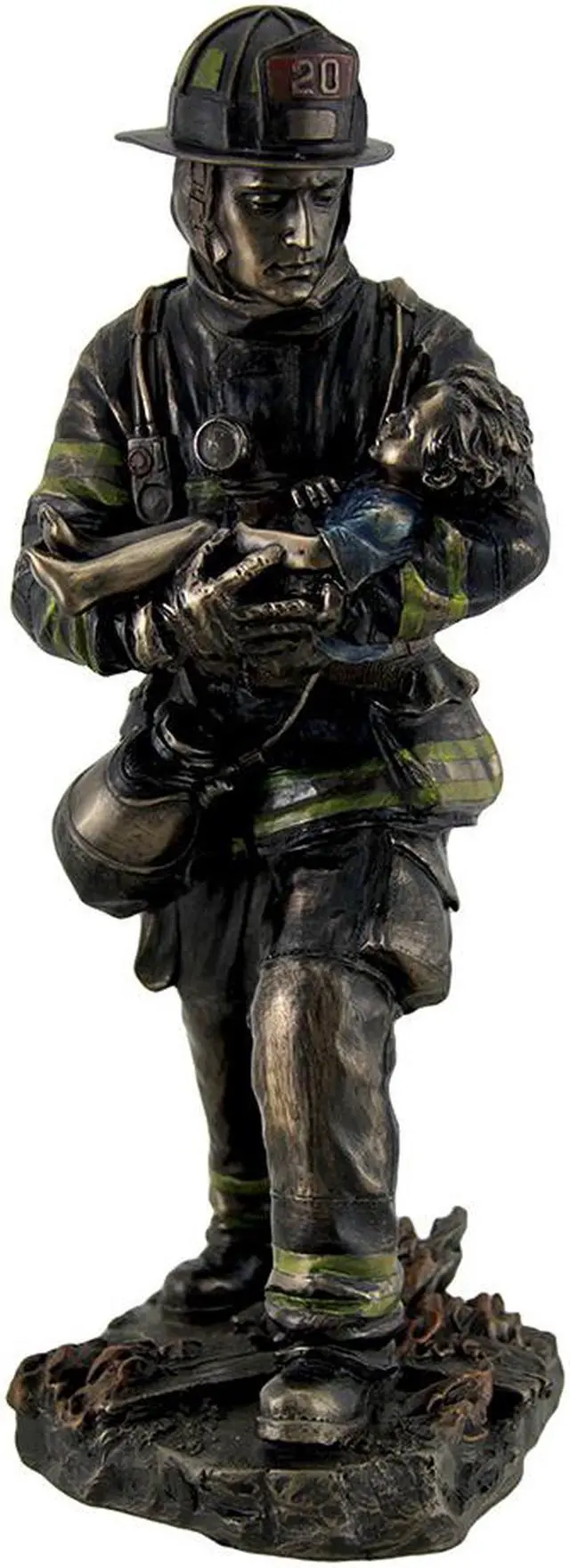 This beautiful bronze metallic finish statue depicts a firefighter carrying a small child safely away from danger. Measuring 11 inches tall, 5 inches long, and 4 1/2 inches wide, this cold-cast resin statue makes a great gift for any first responder.