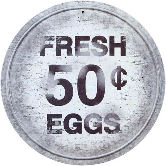Enhance the chic farmhouse style of your kitchen with this Fresh Eggs Fifty Cents Round Advertising Sign. It has a vintage look to it that will give your kitchen a lived in, comfortable feel. Its neutral colors complement all other colors of decor. Use it to decorate any wall in your kitchen- just picture how great it would look next to your fridge or stove. You could also buy it as a housewarming gift for a friend or family member.. Measures 12 x 12 x 1/4 inches. Made of metal with printed design.