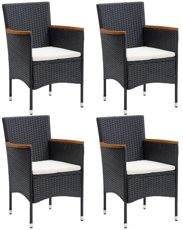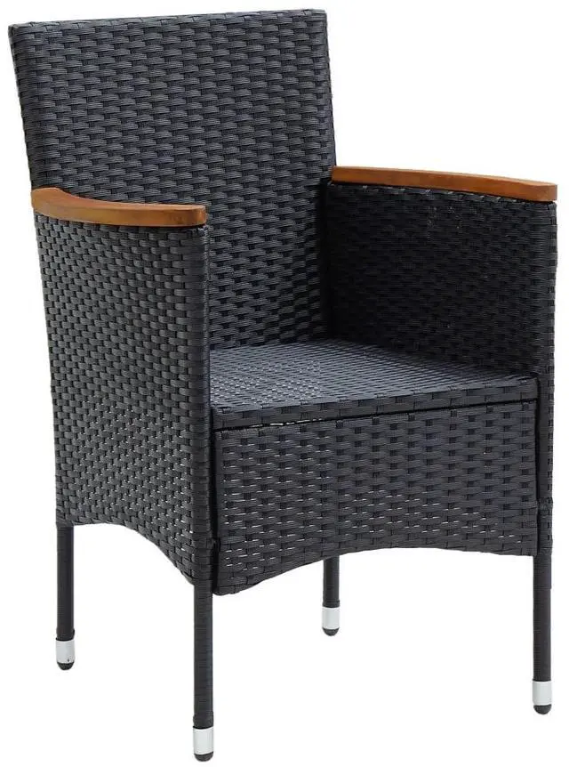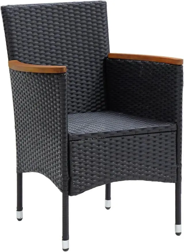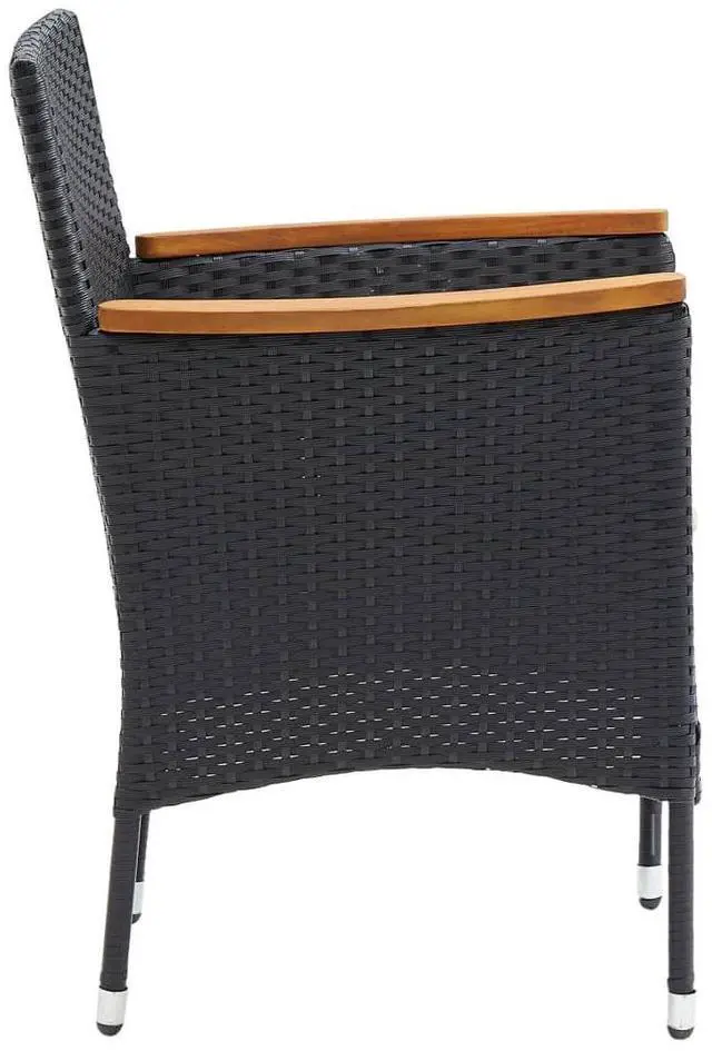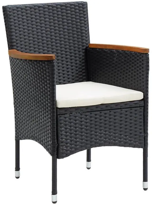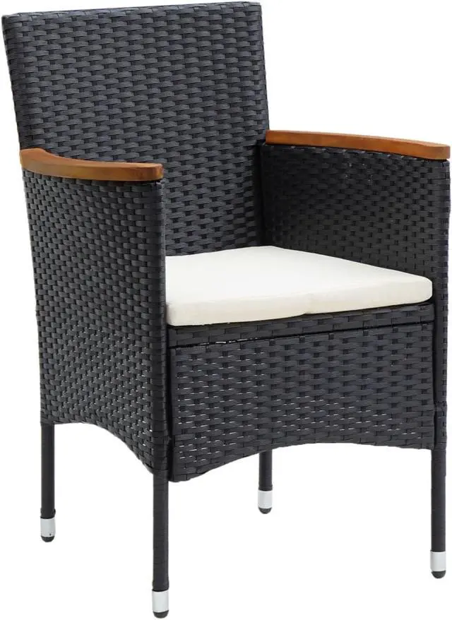 This outdoor dining set of garden chairs is meant to stand out and adds a touch of contemporary style to your outdoor landscape, like gardens, balcony, patio, etc. Sturdy steel frame wrapped with weather-resistant PE rattan, this garden chair set is rust and mildew proof, and provides years of quality relaxation. This outdoor chair set, designed with curved backrest and armrest, features a more ergonomic shape for maximum comfort. The armrests are beautifully decorated with solid acacia wood with a natural oil finish, which brings a sense of rustic charm. Additionally, the thickly padded cushions provide ultimate comfort during your sitting time.