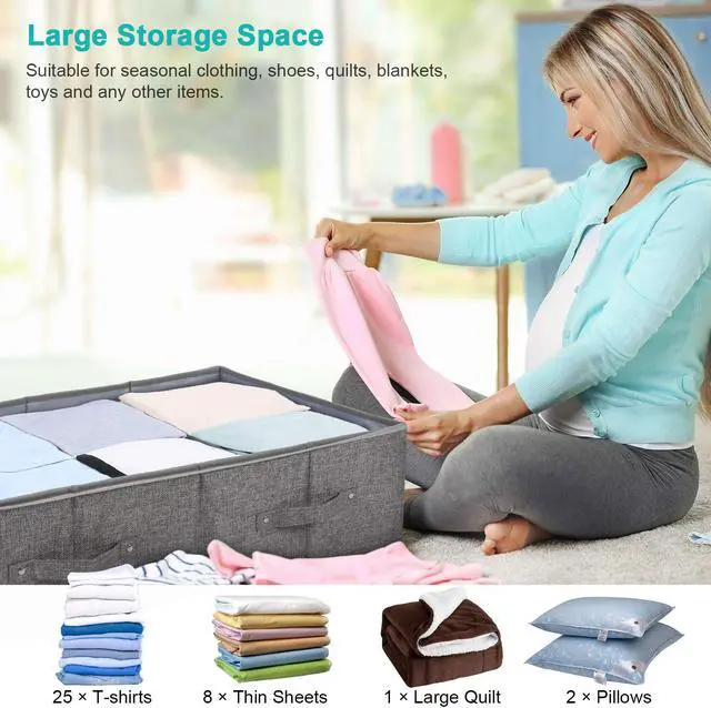 LARGE CAPACITY: Each underbed storage container measures 29.5"L x 15.7"W x 7"H (75 x 40 x 18 cm) and has a capacity of 54 liters.The 2-piece organizer can accommodate two large quilts or clothing like 40 sweaters or jeans. You can put the storage container under the bed or sofa, which makes the room look clean and tidy.