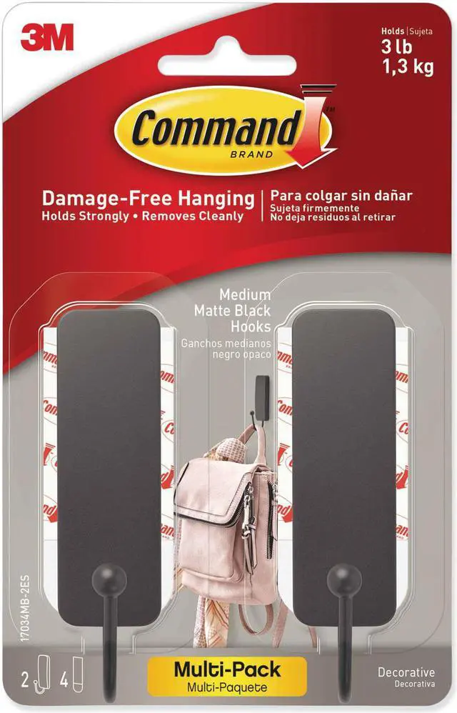 - INCLUDES 2 matte black hooks, 4 medium strips, 1 hook holds 3 lbs.