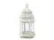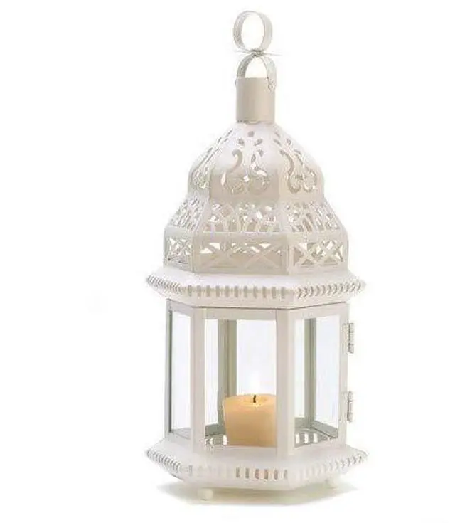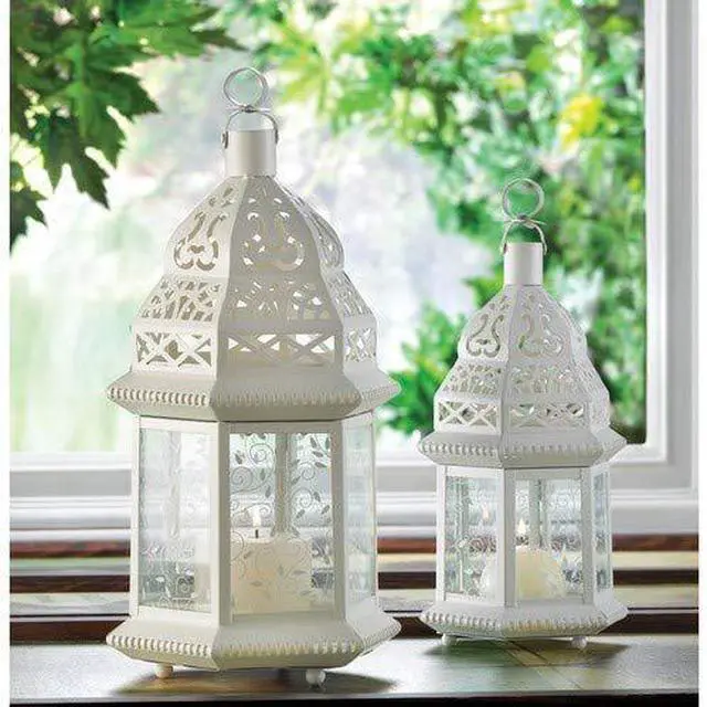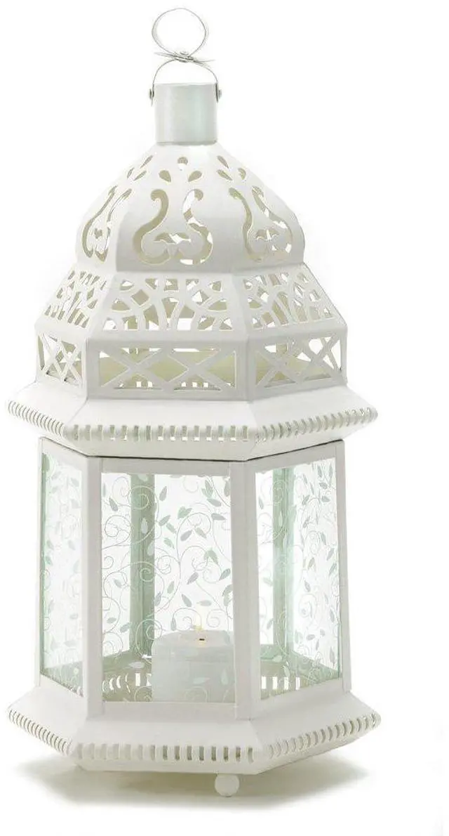 Glass panels have a unique vine pattern, a perfect motif for any garden. Metal lantern has intricate, lacy cutouts. Sits on a table, or can be hung by the loop on top. Metal and glass. 7.75 x 6.75 x 15 inches tall. Candle not included.