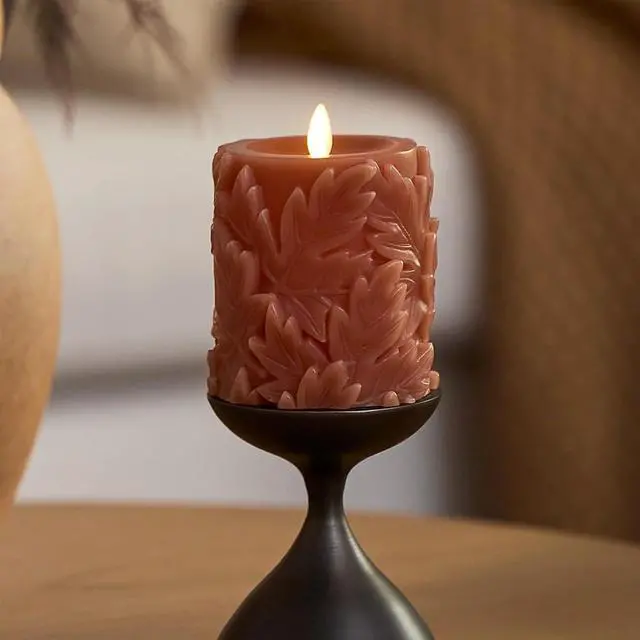 EMBOSSED LEAF DESIGN: Decorative leaf pattern adorns this beautiful, real wax flameless pillar candle. Stunning autumn decoration in warm brown color for mantle, table centerpiece, dining room, entryway or indoor/outdoor display.
