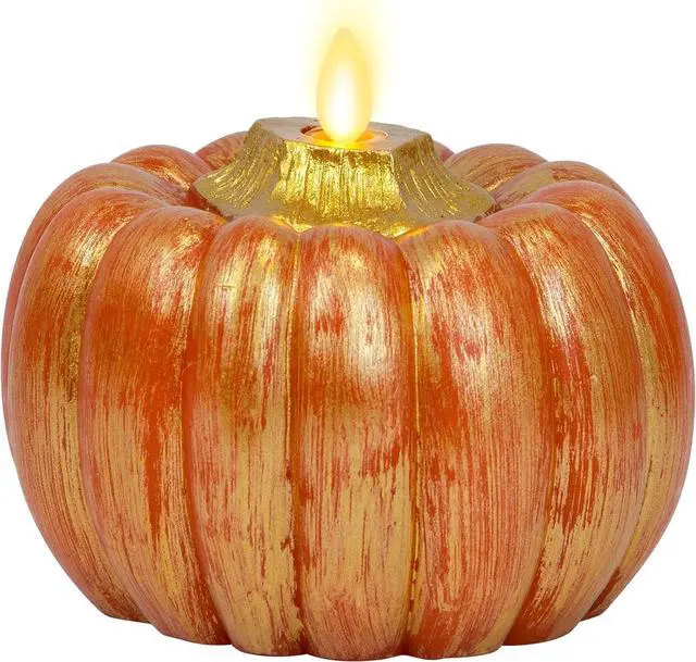 Luminara - Flameless Halloween LED Candle Battery Operated Moving Flame - Metallic Gold Orange Pumpkin - Pack of 1-5x 4.5 - Unscented Indoor Use