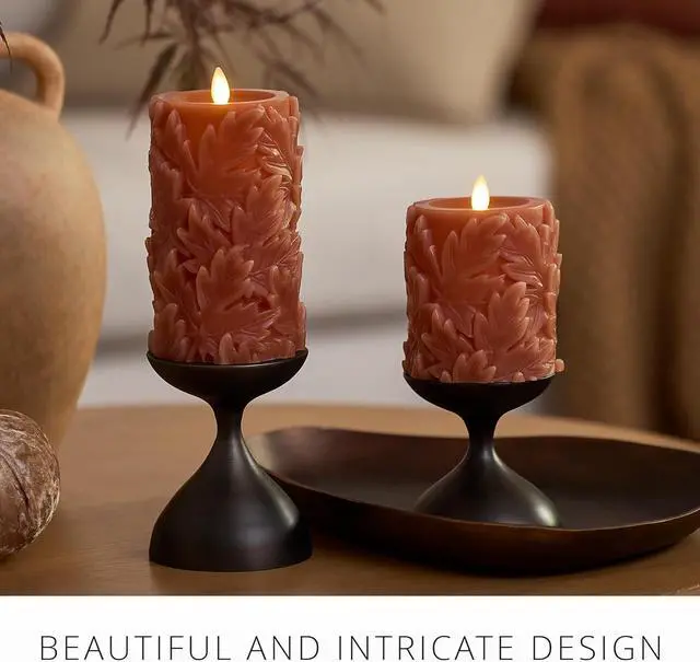 Design & Material: Beautiful 3.5" x 6.5" pillar candle crafted from 100% real wax (Finish: Chalky; Shade Color: Brown With Amber Undertones) featuring an EMBOSSED LEAF DESIGN for a stunning autumn look.