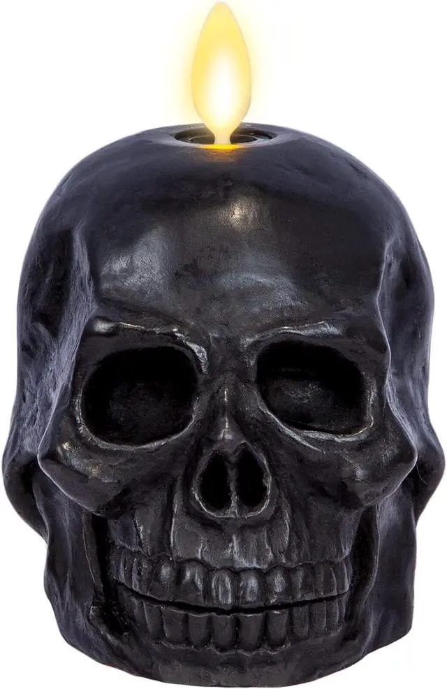 Luminara Flameless Dual Moving Flame Large Skeleton Skull Figural ( 5.85" x 7.5" ) Real Wax LED Candle, Unscented, Timer - Black