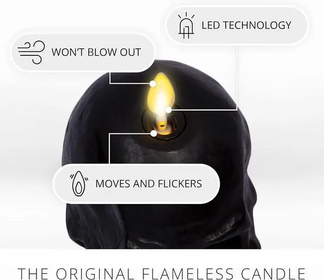Design & Material: Small Black Flameless Skull Candle made with 100% pure paraffin wax, hand poured with realistic sculpted details. Matte finish.