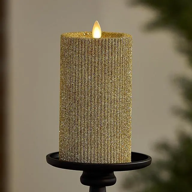 Glowing with Real-Flame technology, the Rich Gold Glitter Ribbed Pillar has a ribbed texture and double-dipped glitter finish that adds an elegant and celebratory shimmer to the holidays.
