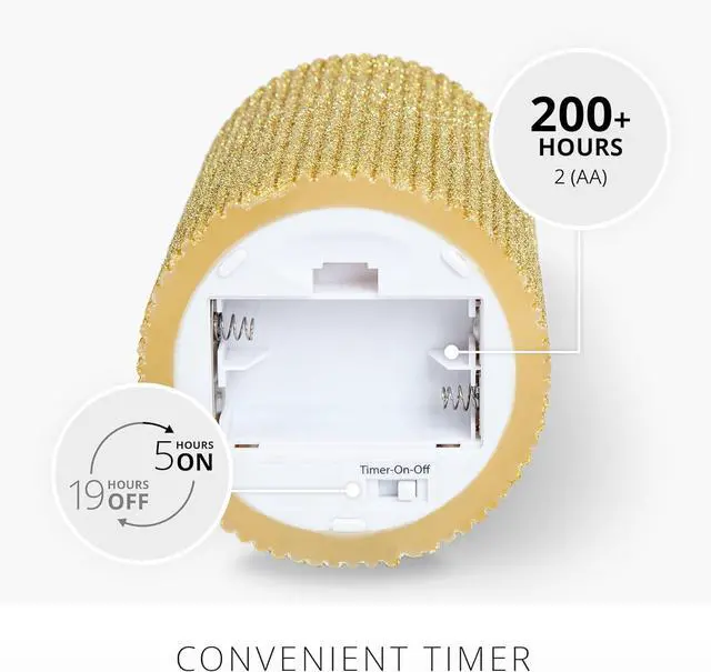 Powered by 2 AA batteries (not included), each candle offers 200 hours of safe and long-lasting illumination. Set the timer for 5 hours of brilliance, followed by an automatic 19-hour shutdown.