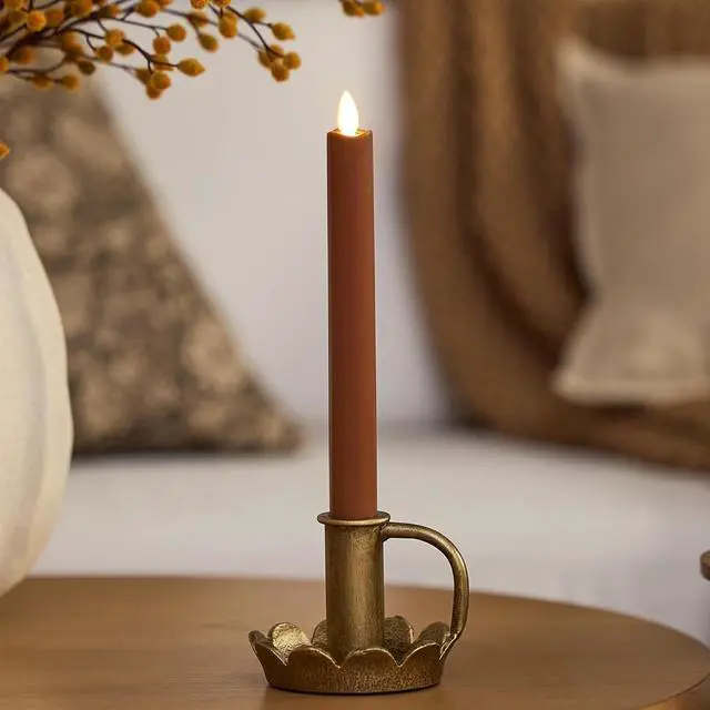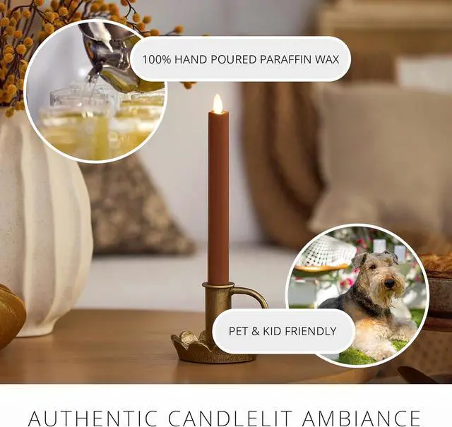 Powered by patented moving-flame technology, this amber-brown wax-dipped taper illuminates with an inviting and elegant aura that is completely safe and convenient to place alongside your favorite fall decorations.