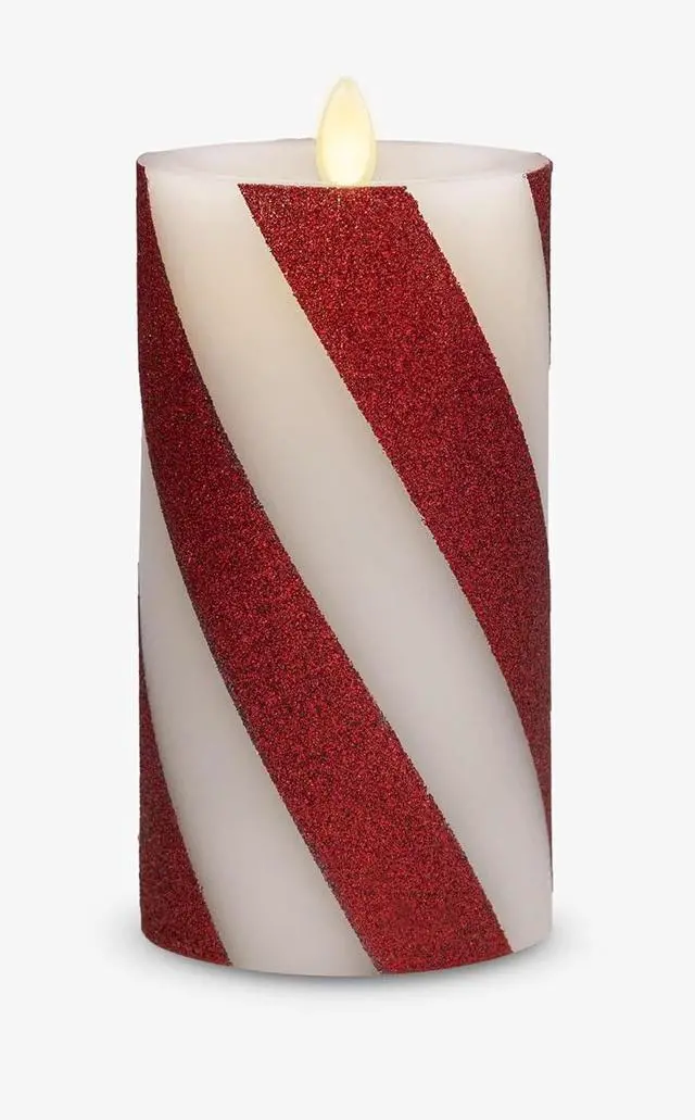 Add a sweet accent to your holiday décor with our flameless candy cane pillars. Our hand-poured wax pillars give a festive touch to your holiday with wide candy cane stripes of red glitter.