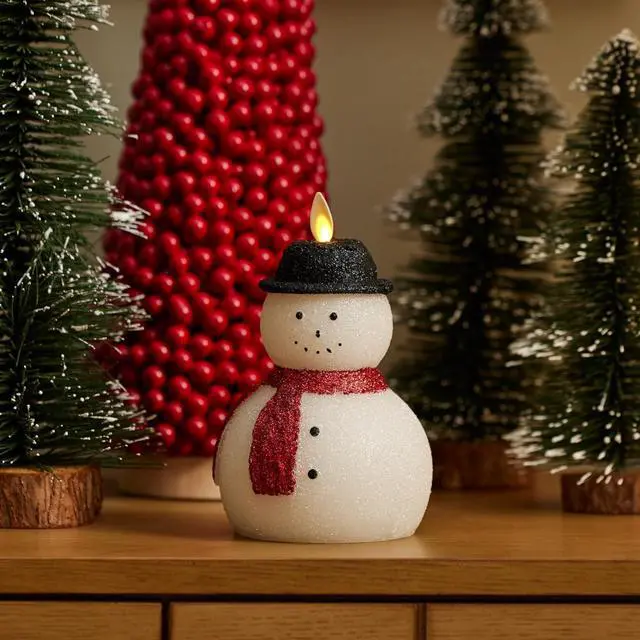 This charming snowman flameless candle has a joyful expression and sparkling glitter finish that easily complements the merry spirit of the holiday season.