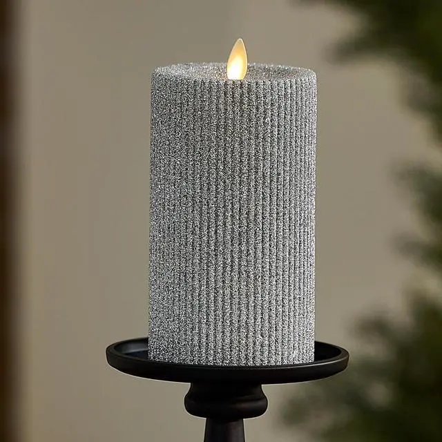 Luminara Brilliant Silver Glitter Ribbed Flameless LED Candle Moving Flame Pillar, Real Wax, Flat Top, Timer ( 3.25" x 6.5" )