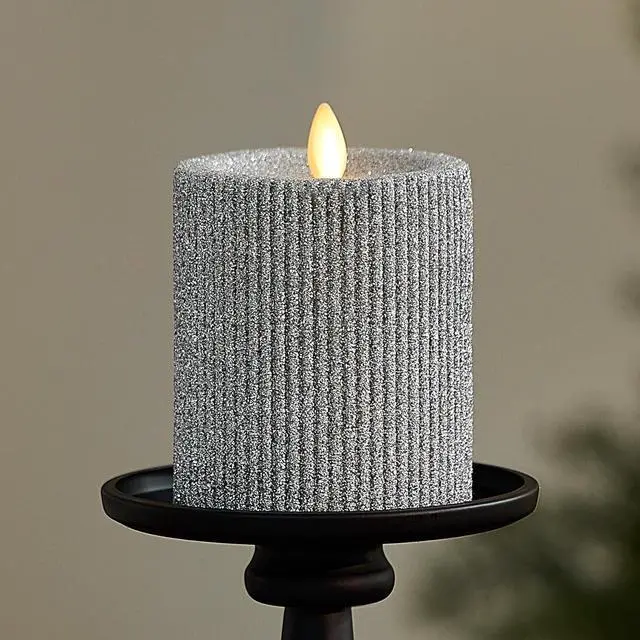 The beautiful ribbed texture and lustrous double-glitter shine of the Brilliant Silver Glitter Ribbed Pillar radiates with worry-free moving-flame technology that sparkles with the magic of the holidays.