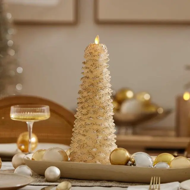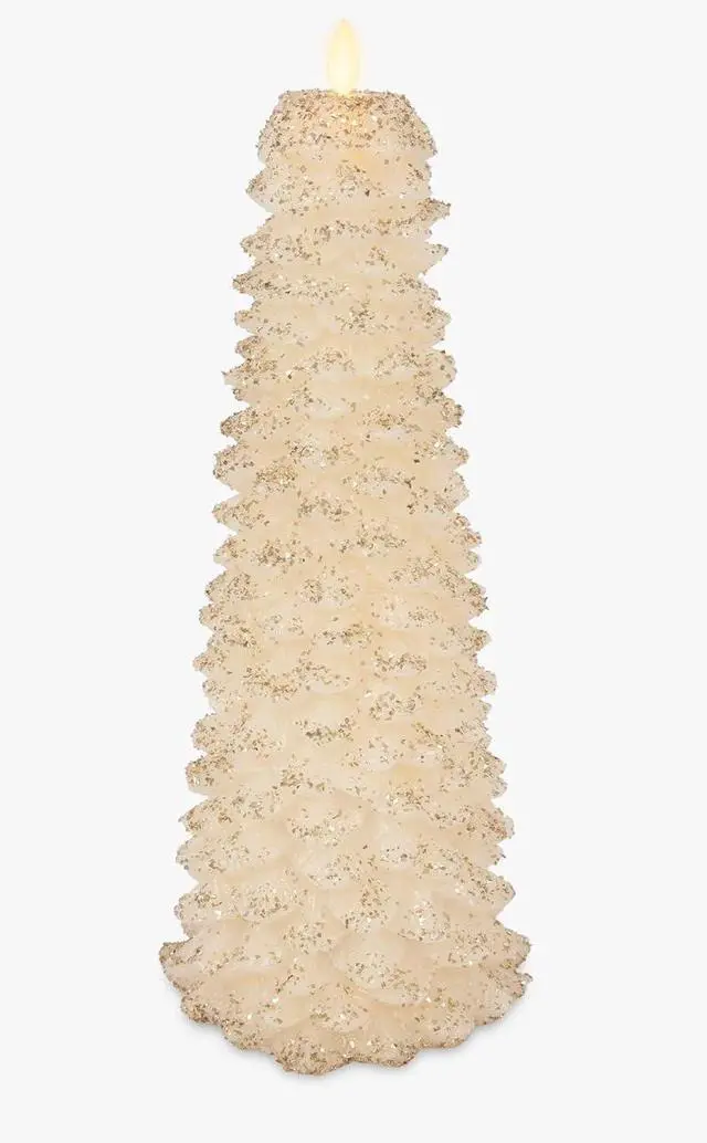 Design & Material: Tall and slender, glittery, glowing flameless candle tree (Shape: Tree; Style: North Tree) designed to bring a chic, modern touch to décor. Crafted from unscented 100% REAL WAX (Shade Color: White; Finish: Chalky).