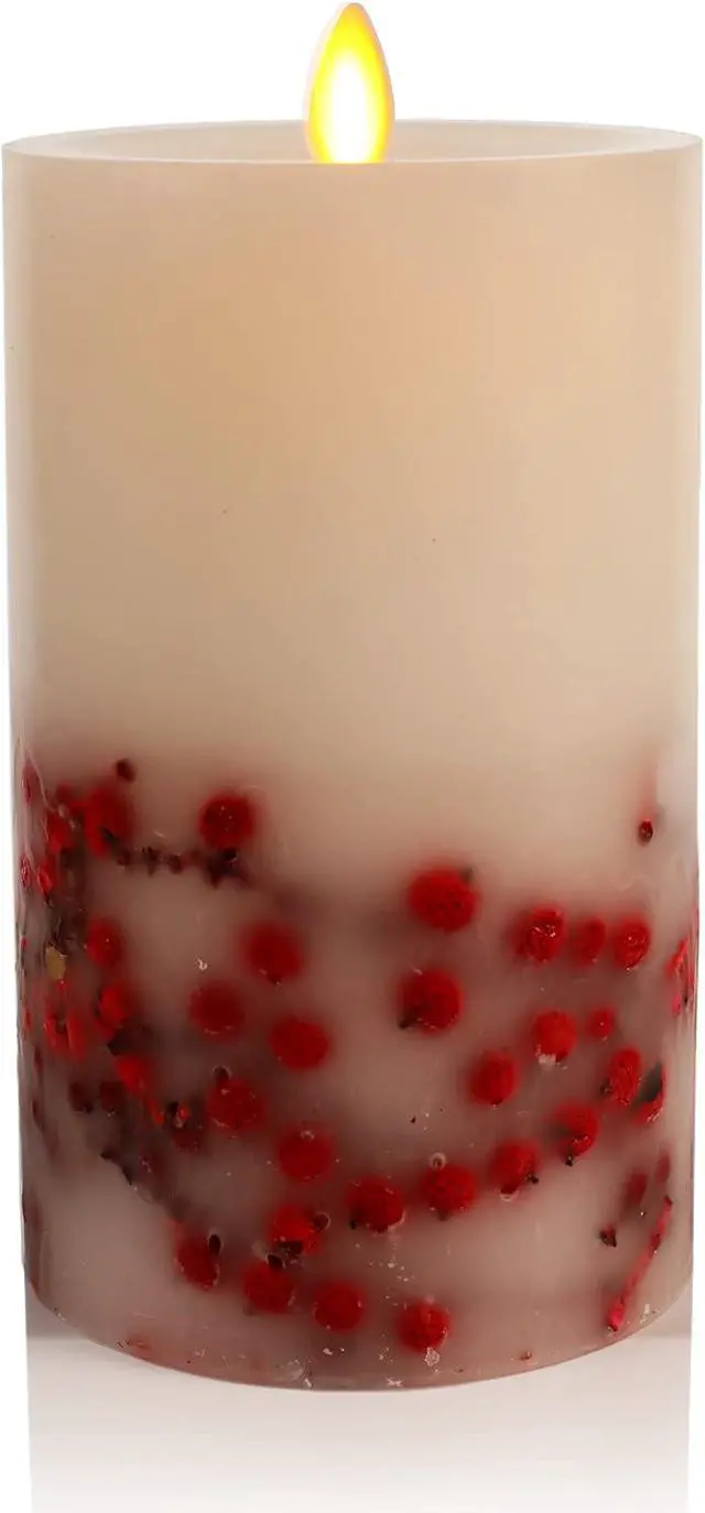 Luminara Red Berry Inclusions Flameless Candles are made with 100% pure paraffin wax, hand poured and carefully designed to look like traditional candles. They are safer to use than traditional candles, since no actual combustion or wax consumption happens. That means no soot or chemicals are released into the air, making them perfect for use indoors. They're perfect for households with small curious children and rambunctious pets.