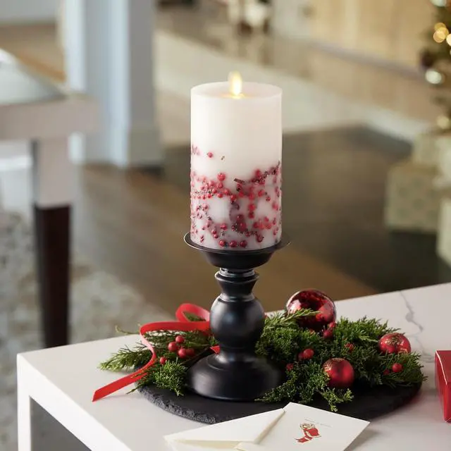 This Luminara Red Berry Inclusions Flameless Pillar is the fashion-forward centerpiece for all your candle décor needs. We selected this modern melted design to showcase the dancing Real-Flame Effect from all angles, ensuring endless decorating possibilities!