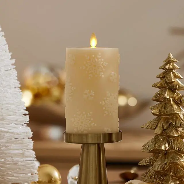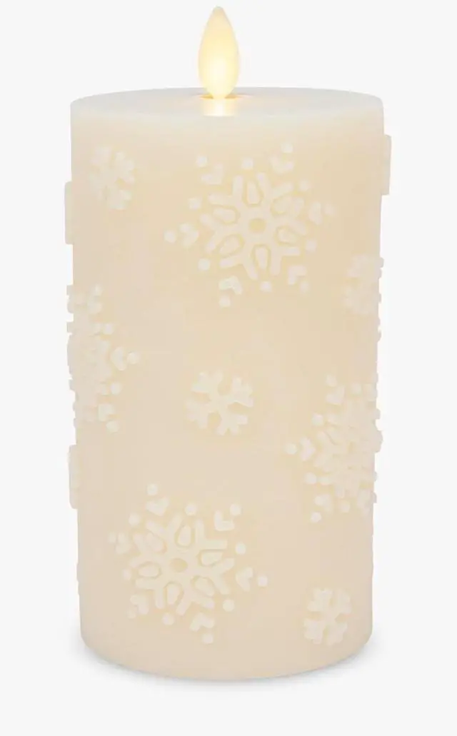 Adorned with beautiful snowflake reliefs, these glowing flameless candle pillars add minimalist elegance and warmth to holiday tablescapes.