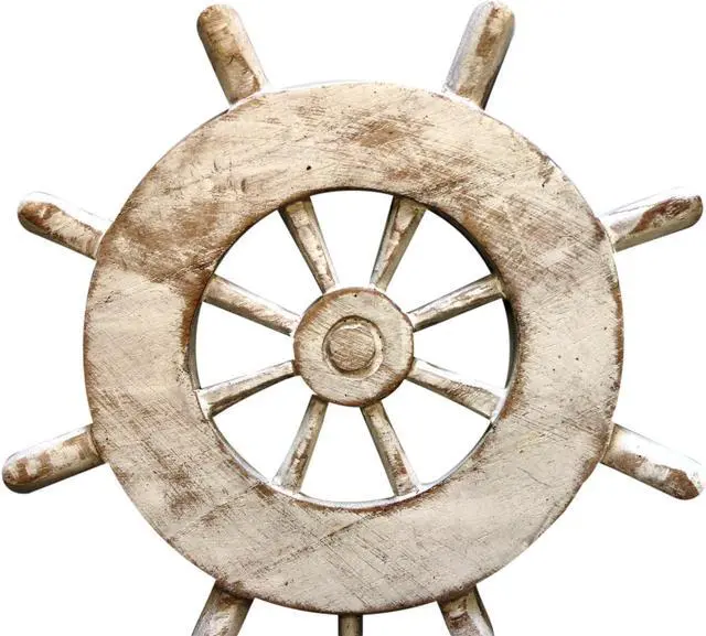 This single wall hook features a charming ship's wheel design so that you can accessorize your home in beautiful nautical style. The hand-carved wooden texture and whitewashed finish make it a truly special piece of maritime decor. Just imagine how wonderful this hook would look decorating your front hallway or master bedroom.. Measures 9 x 8 x 3 inches. Made of hand carved wood with metal. Keyhole hanger on back for hanging, imported