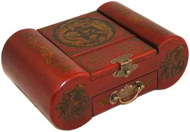 Store your most valued treasures in this fine, vintage jewelry box. It comes with three sliding drawers and a built in mirror. The surface is encased with beautiful oriental theme leather. Size: L8" x W9" x H10"