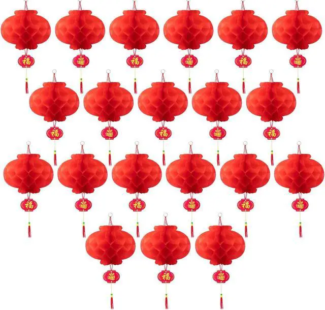 Lantern design: this red hanging lantern features a honeycomb nest shape and attached is a hanging tag printed with "Fu", which represents the coming of New Year and good luck. The red color is the traditional Chinese festive color, symbolizing good luck while red lanterns symbolize festivity and family in Chinese culture. With its special shape and structure, the bee comb shape with dense holes helps make unfolding and collapsing the lantern easy making storage and reusing easy