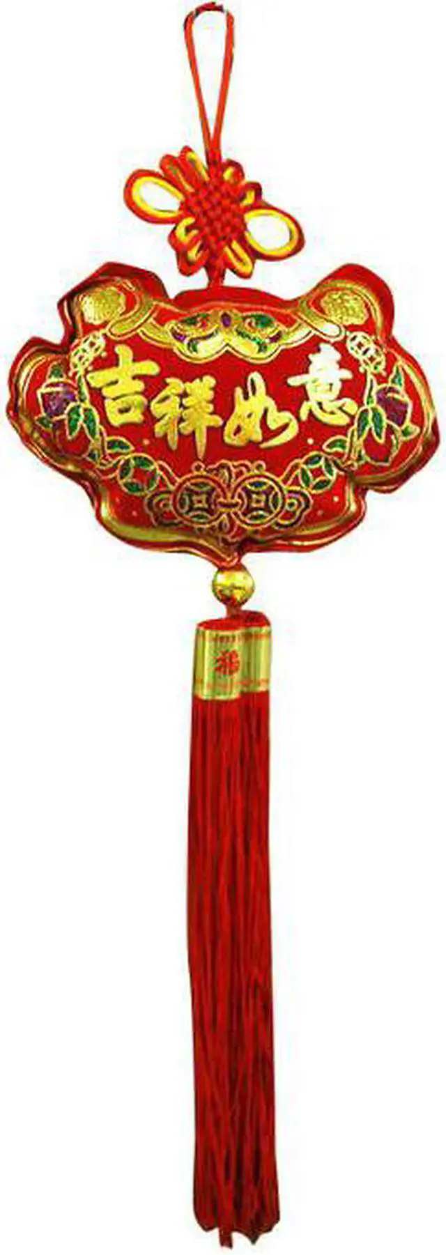 Beautiful Feng Shui wall hanging with Chinese tassels. Chinese calligraphy "Ji Xian Ru YI" means "Lucky". Size including tassels: L17" x W6" x D1 1/2" Material: Fabric