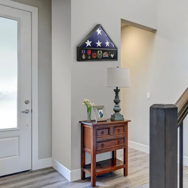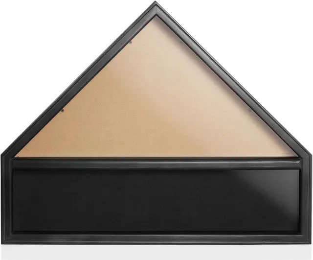 Our flag and shadow box display cases are designed with years of expertise and skilled master craftsmanship. Handcrafted from solid wood, with an elegant finish, for long-lasting strength and durability. Our glass front preserves and protects your flag, medals, and insignia. The removable back panel features turn-button closures, providing easy access to both the lower shadow box and flag case compartments. Holds a 5' x 9.5 ' military burial flag. Two strong hangers provide the option to hang the flag case on the wall or display on a shelf.