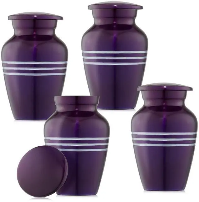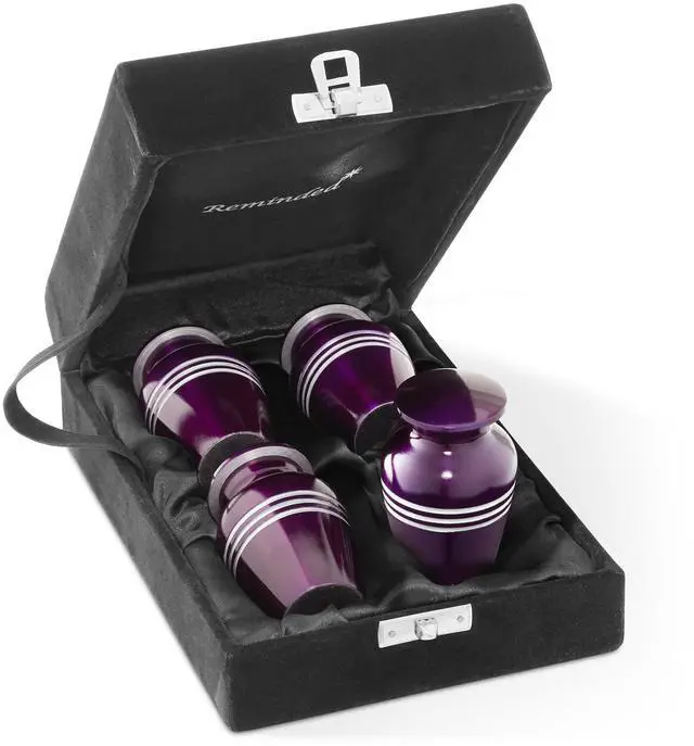 Urns are designed with years of expertise and skilled master craftsmanship for long-lasting strength and durability. Our handcrafted aluminum urns are handcrafted and polished with an elegant finish. Set of 4 Urns come in a satin lined case and 4 black velvet bags that close securely with a dual drawstring to preserve the exterior, protecting the urn from tarnishing, scratches, damage, and dust. All urns are made with threaded lids, ensuring that ashes are securely preserved with the utmost respect and tribute.