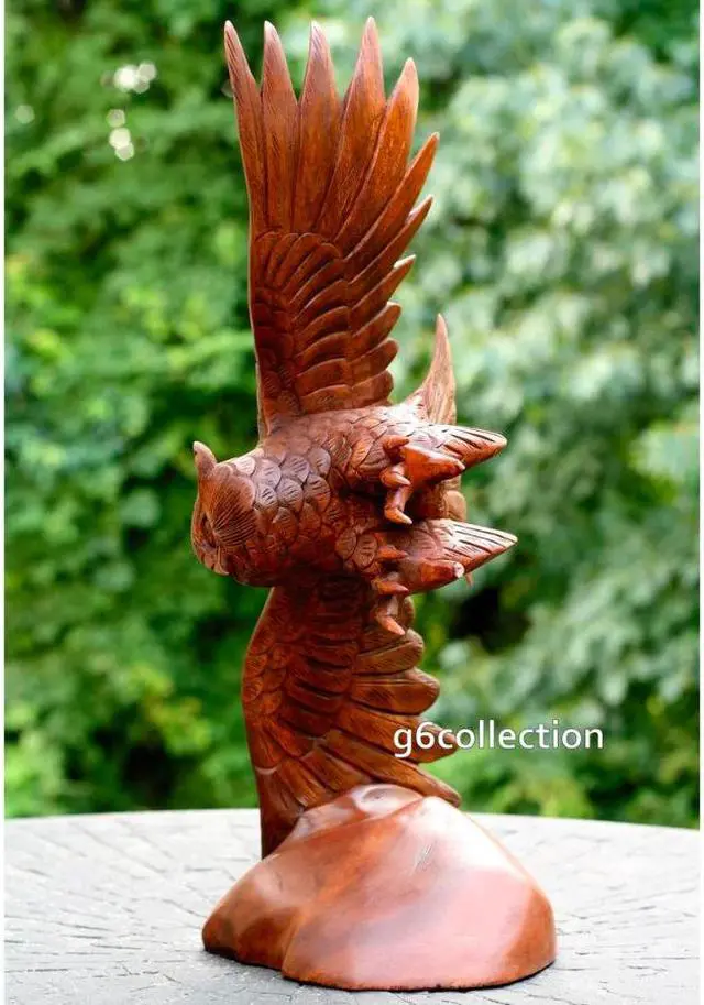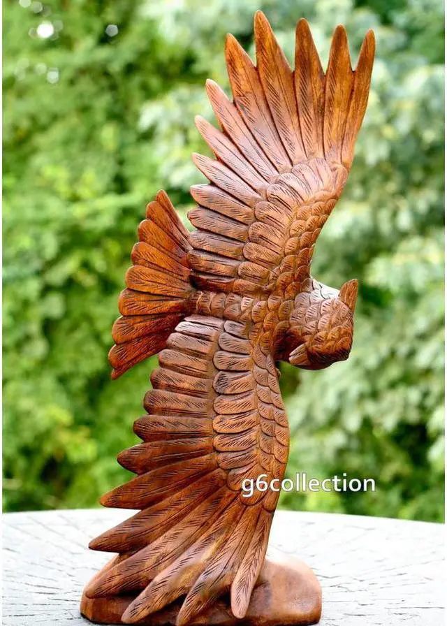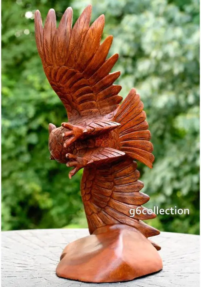 This intricately carved owl is hand made from suar wood and features some of the most amazing detail and style. Every feather is designed to look almost real as the owl soars with its wings spread over the stump that supports this statue. A beautiful addition to your home decorative scheme.
