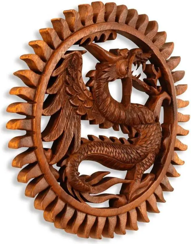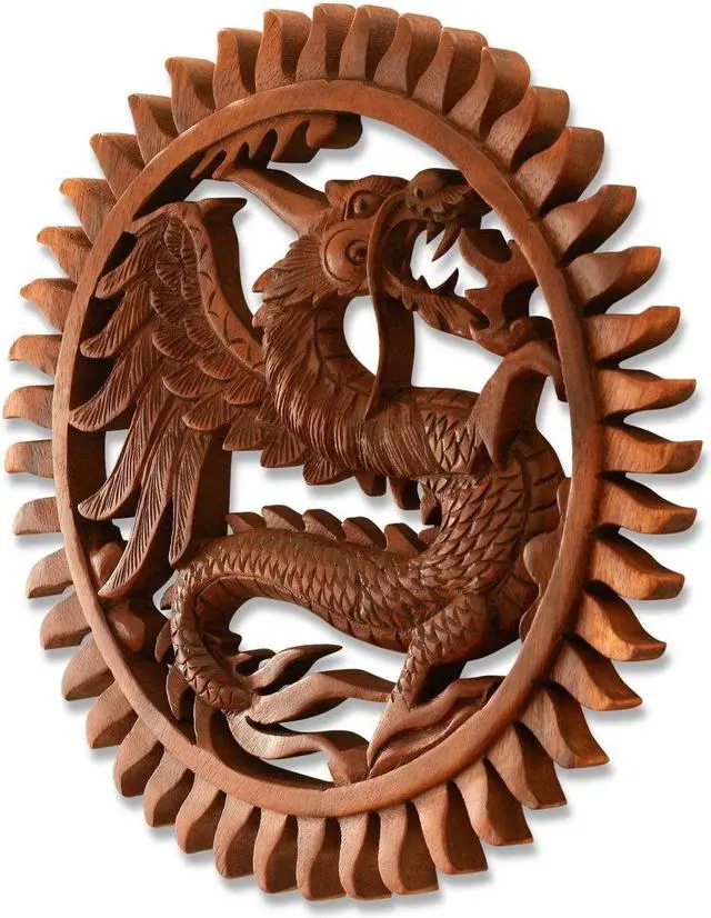 Symbols of the supernatural, dragons are fire-breathing lizards that impose fear in true believers. With its powerful presence, the dragon glorifies what it means to be feared by others. Salute the serpent within by placing this handmade wooden carving on your wall. Hand-carved from suar wood, it's an artistic rendition of strength and influence.