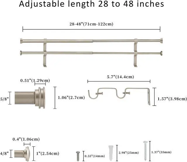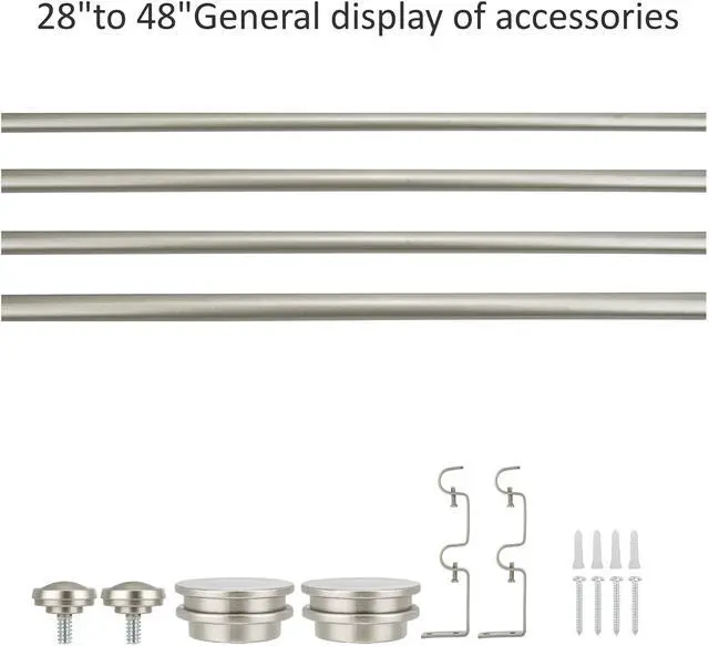 1.Double curtain rod:The 28"-48" rod set includes 4 rods,4 finials, and 2 double brackets.48"-84" has 4 rods,4 finials, and 3 double brackets and 84"-120" with 6 rods,4 finials, and 3 double brackets.