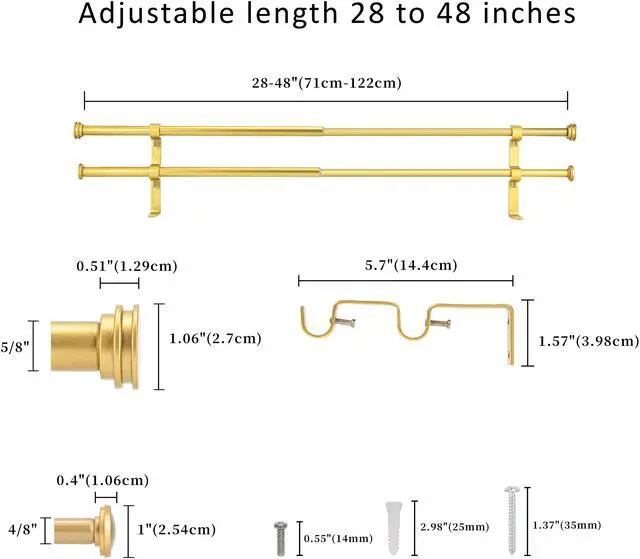 1.Double curtain rod:The 28"-48" rod set includes 4 rods,4 finials, and 2 double brackets.48"-84" has 4 rods,4 finials, and 3 double brackets and 84"-120" with 6 rods,4 finials, and 3 double brackets.