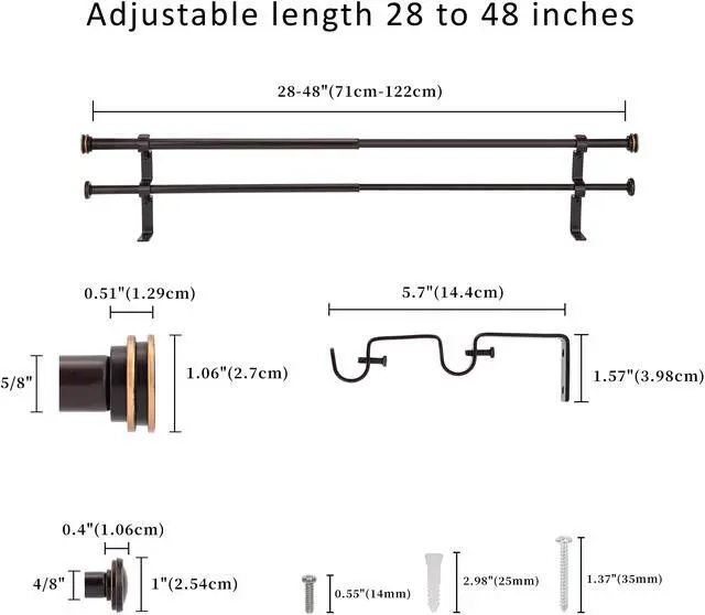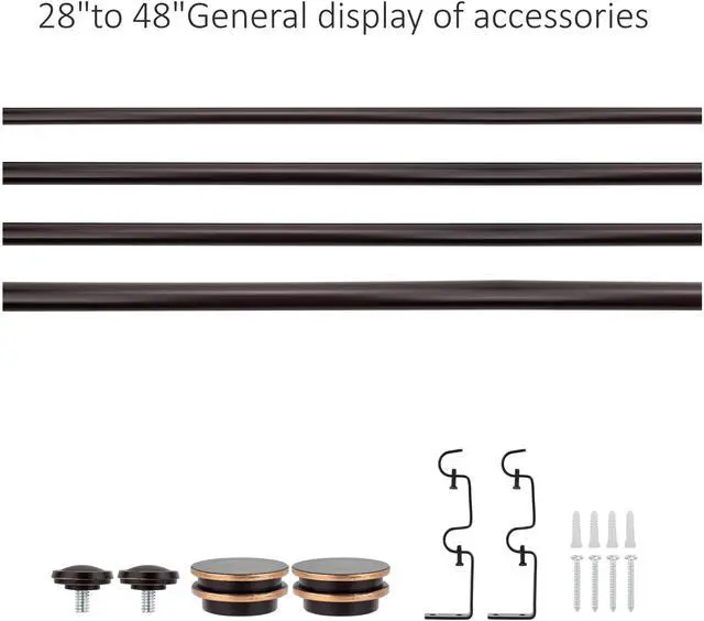 1.Double curtain rod:The 28"-48" rod set includes 4 rods,4 finials, and 2 double brackets.48"-84" has 4 rods,4 finials, and 3 double brackets and 84"-120" with 6 rods,4 finials, and 3 double brackets.