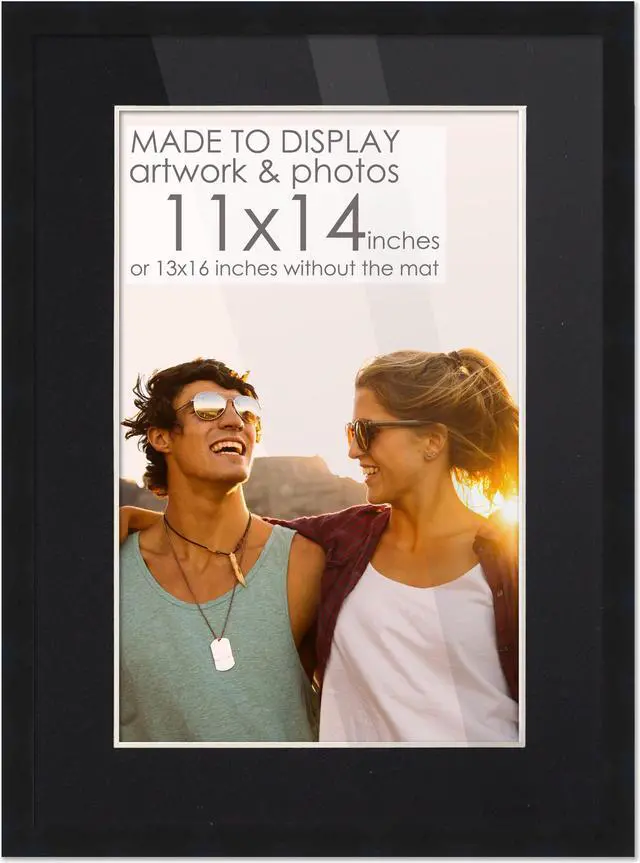 11x14 Frame Black for 11x14 Picture or 13x16 Art Poster Without Black Photo Mat. The included Black Picture matte is Acid-Free to protect your prints, pictures, posters, photos, fotos, or puzzle. This Black frame is constructed from pine wood. Great for your walls decor, boho theme, canvas art, kitchen art, rustic art, livingroom art, neutral theme, painting, drawing, industrial, mirror art. Each frame includes UV resistant, shatter guard, frame grade acrylic, in place of standard glass. Acid-free white foam board backing and metal hanging hardware are also included.