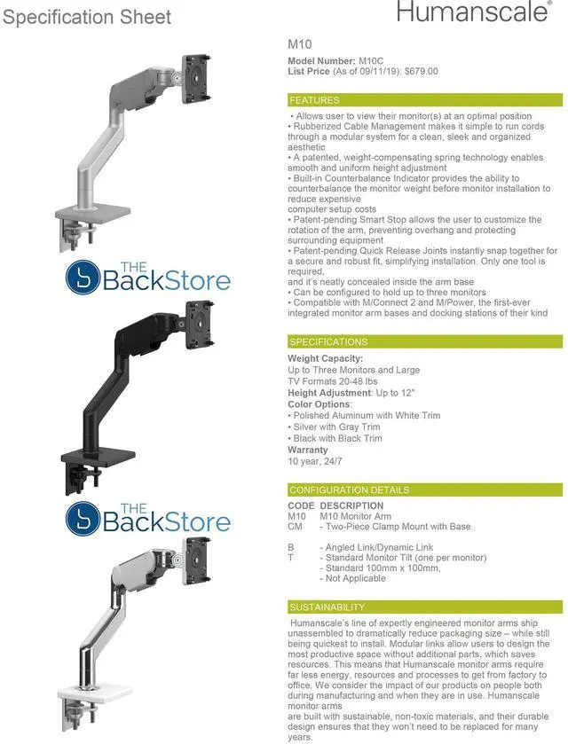 Humanscale M10 Adjustable Heavy Duty Monitor Arm with Angled / Dynamic Links - Two Piece Clamp Mount - In todays fast-paced, agile work environment, theres no time for discomfort. M10, part of Humanscales revolutionary new monitor arm line, instantly improves the comfort, health and productivity of any workspace. Built to hold heavier equipment, a strong triple crossbar allows M10 to hold up to three monitors or 48 pounds all while maintaining a simple and sleek design. Featuring innovations like Humanscales patented Weight-Compensating Spring Technology and Smart Stop functionality, M10 enables the personalization and flexibility needed for todays evolving workplaces.