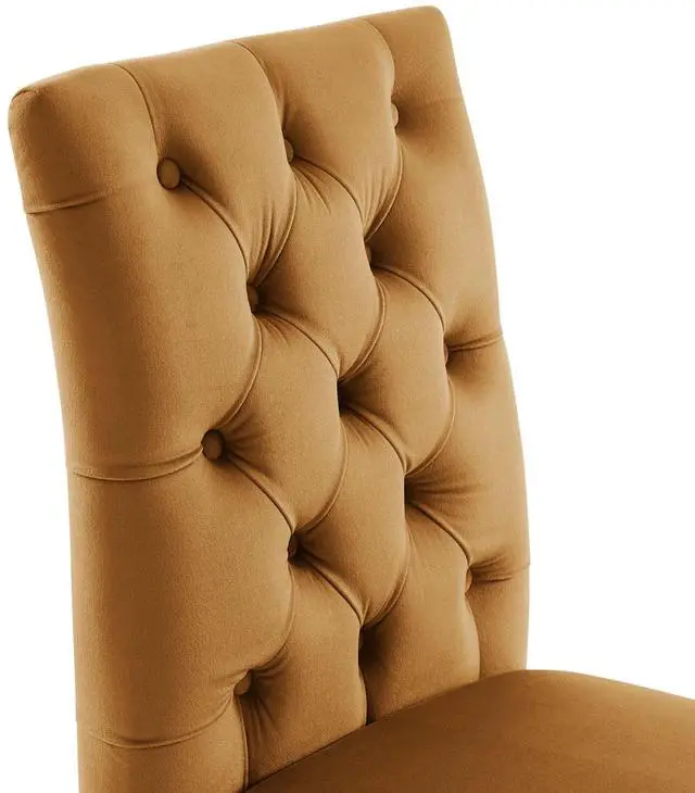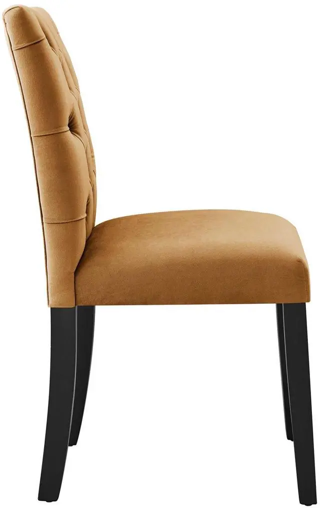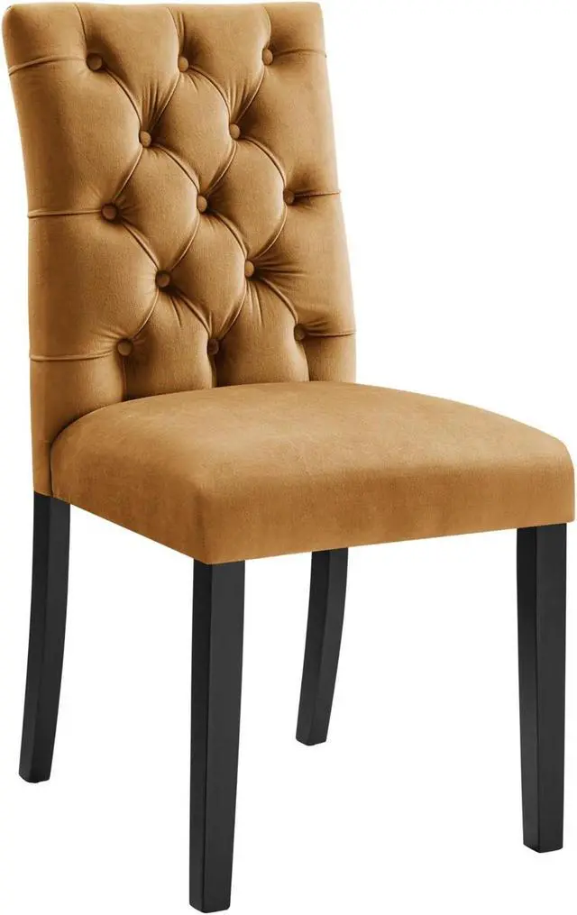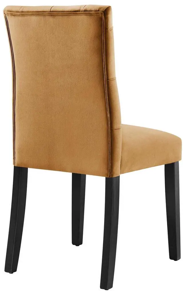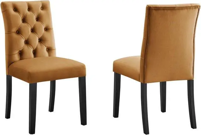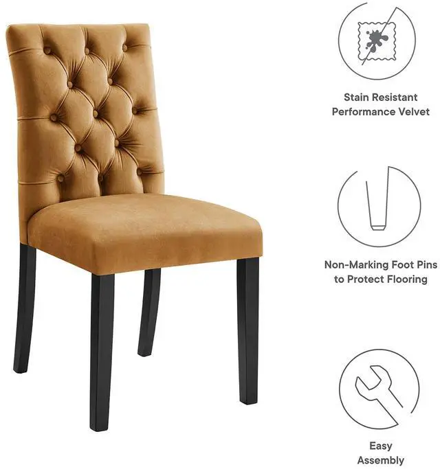 Bestow elegance with the Duchess Dining Chairs - Set of 2. Chic and luxurious, these dining chairs feature a stylish curvy form, richly tufted button back, stain-resistant performance velvet upholstery, and wood legs topped with non-marking foot caps. Dense foam padding and a sinuous spring support system grant a premium seating experience. Resonate grace and charm with a dining chair set perfect for the modern home. Set Includes: Two - Duchess Performance Velvet Dining Chair