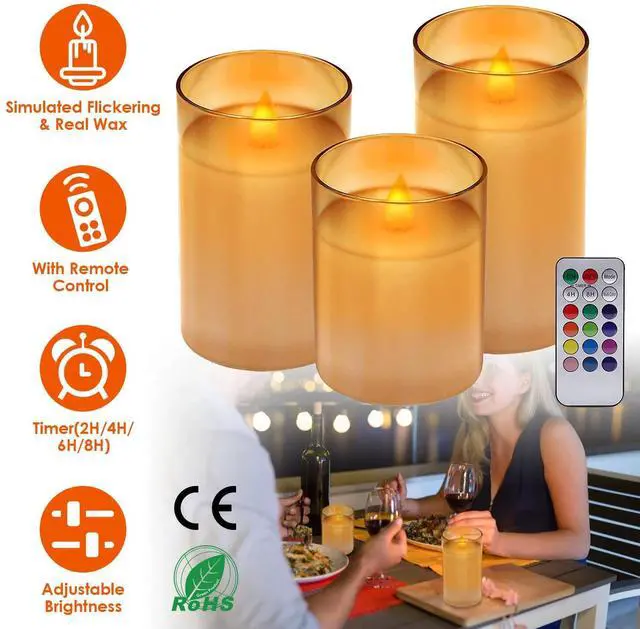 Real Candles:Composed of real paraffin and transparent glass,these candles not only offer the look of real candles,but also emit warm light,flicker and dance like real ones. Create a warm and romantic atmosphere for wedding,party,dinner,and Christmas.
